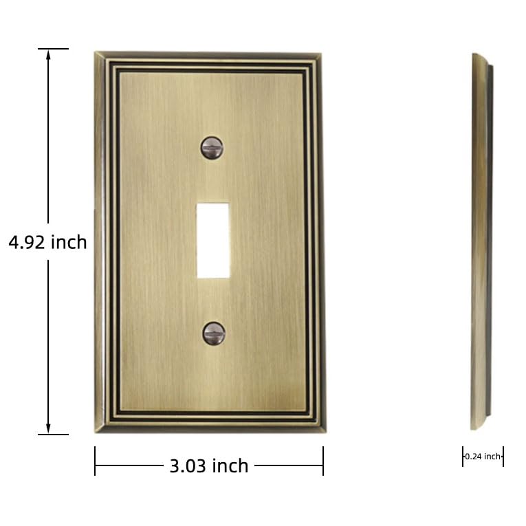 Antique brass light switch cover, zinc alloy, standard size 4.92 x 3.03 x 0.24 inches, single toggle plate with screws included.