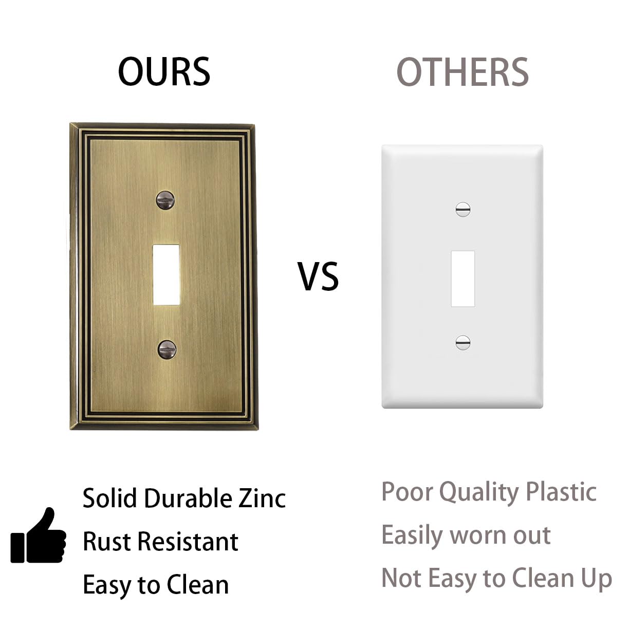 Comparison of antique brass light switch cover made from durable zinc against plastic alternative.