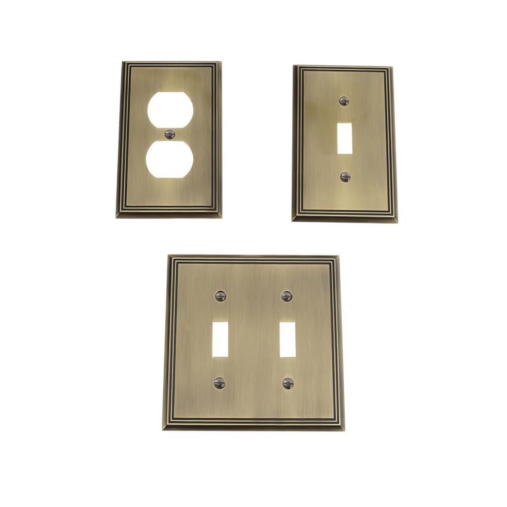 Various designs of antique brass light switch covers, including single toggle and outlet styles, made from durable zinc alloy.