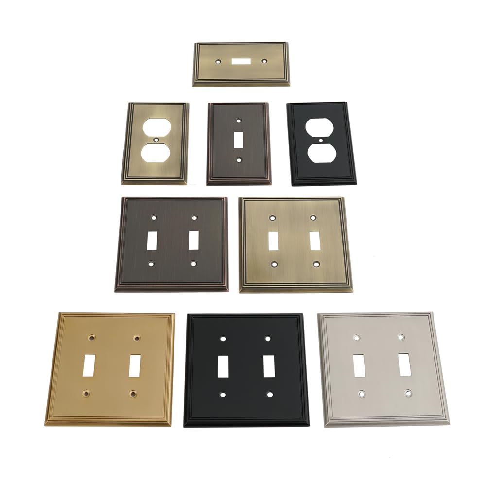 Various designs of antique brass light switch covers, including single toggle and outlet styles, made from durable zinc alloy.